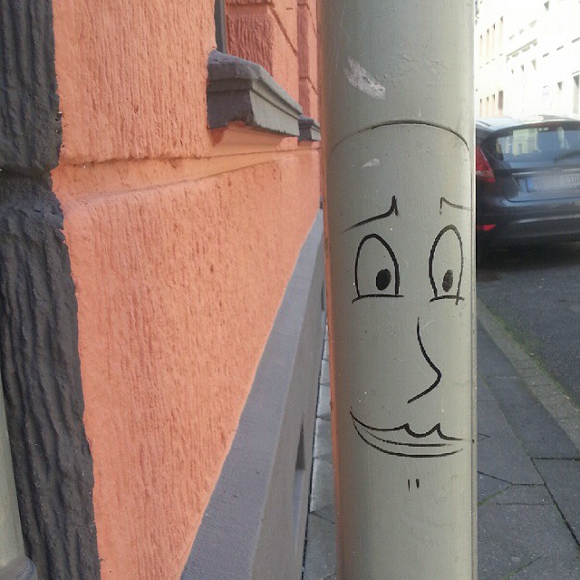 Gesichtsgraffiti auf Straßenlaterne auf der Gasthausstraße, Gladbach