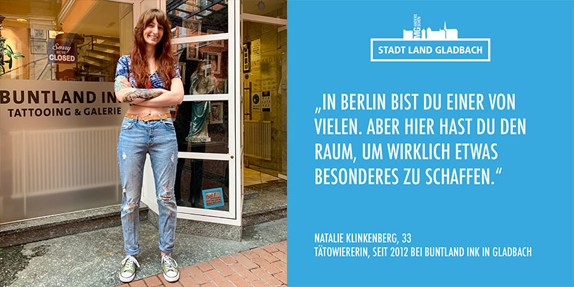 Es war kein einfacher Weg, doch ich bin sehr glücklich, heute meinen Traumberuf ausüben zu können. Das Tätowieren ist sehr interessant und abwechslungsreich. Zu sehen, wie glücklich die Menschen ihr neues Tattoo macht, gibt mir unglaublich viel. Bei Buntland Ink bin ich schon seit der Ausbildung – wir sind wie eine kleine Familie geworden. Mir war schon früh klar, dass ich nach Mönchengladbach ziehen möchte. In meiner Jugend war ich oft an den „Treppen“ am alten Stadttheater. Das war ein Ort, an dem alternative Jugendkultur ihren eigenen Platz hatte. Als er abgerissen wurde, hatte ich Tränen in den Augen. Ich lebe so gerne hier, weil Mönchengladbach großstädtisch, aber nicht zu anonym ist. Die Menschen sind bodenständig, offen und haben das Herz am rechten Fleck. Ich finde, es ist nicht mehr die Zeit, wo man nach Berlin ziehen muss, um was zu erleben. Wir schaffen uns hier unsere eigenen kleinen Szenen, werten unsere Heimat auf und machen es uns schön. In Berlin bist du einer von vielen. Aber hier hast du den Raum, um wirklich etwas Besonderes zu schaffen.“