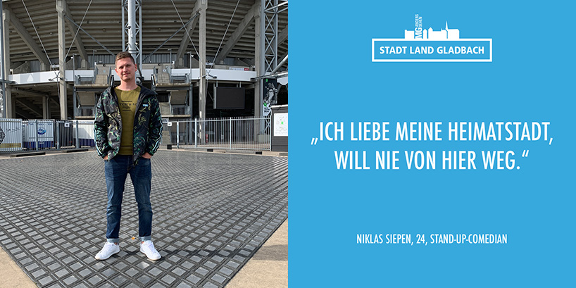 Bei unserer Abifeier im Odenkirchener Gymnasium habe ich die Moderation übernommen und die Stimme von Stefan Raab und einigen unserer Lehrer imitiert. Das war vielleicht der Anfang. Ich habe zunächst drei Semester Journalismus studiert, dann bin ich nach Venlo gewechselt, studiere dort Marketing. Kann ich sicher für meine Zukunft gebrauchen. Meine Social Media Marketing Agentur steht in den Startlöchern. Aber mein Hauptziel ist die Stand-up-Comedy-Bühne. Inzwischen habe ich ein gutes Soloprogramm, mit dem ich mich auf offenen Bühnen präsentiere. Meine Texte teste ich vor Publikum, sie sollen so rüberkommen, als würden sie in dem Moment spontan entstehen. Die Corona-Zeit hat uns alle ausgebremst. Aber im Sommer hatte ich neben Markus Krebs, Johann König, Maxi Gstettenbauer (meinem Vorbild) und anderen einen Auftritt im Sparkassen-Park beim Comedy-Splash vor 2000 Zuschauern. Unglaublich! Mönchengladbach ist meine Heimat. Wenn ich auf die Stadt zufahre, sehe ich das Stadion und bin gleich zu Hause. Ich liebe meine Heimatstadt, will nie von hier weg. Hier sind meine Wurzeln, hier hat meine Karriere angefangen. Ich kenne meine Nachbarn, und in der Altstadt treffe ich immer Freunde und Bekannte.“