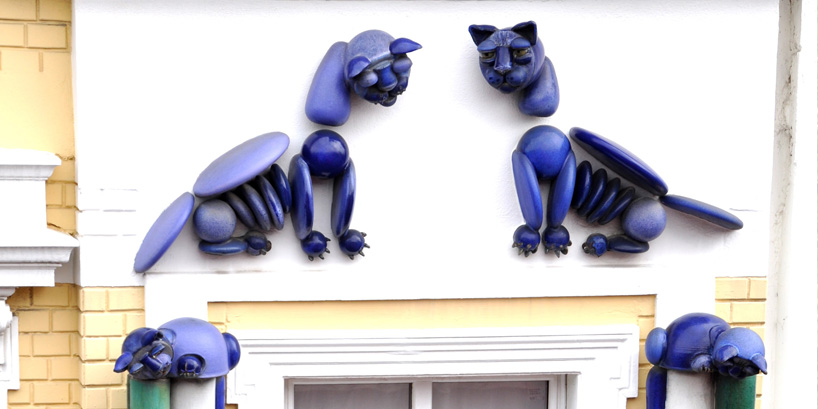 An der Albertusstraße Nummer vier steht ein hübscher gelber Altbau aus der Gründerzeit, ähnlich wie er an mehreren Orten in Mönchengladbach zu sehen ist. Schaut man nach oben bleibt das Auge des Betrachters an einem außergewöhnlichen Fassadenschmuck hängen. In kräftigen Blau- und Grüntönen sind Stuckformen aus Keramik nachempfunden und vier Katzen blicken auf die Straße herunter.